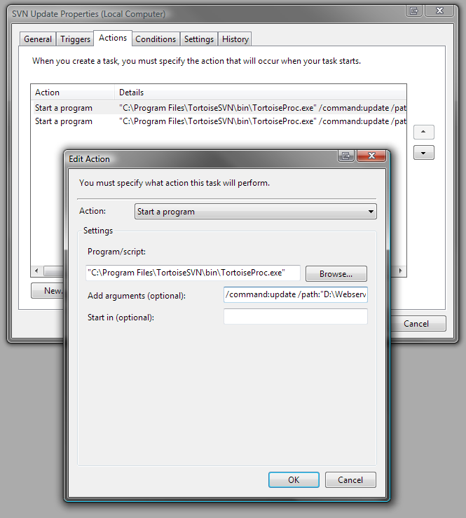 Actions: Here’s the arguments (change the path): /command:update /path:”D:\Webserver\htdocs\wordpress-trunk\” /closeonend:1 Published September 29th, 2008 at 665 × 739 in Automatically Keep Your SVN Checkouts Up To Date In Windows – Rev. 2 ← Previous Next → Actions: Here’s the arguments (change the path): /command:update /path:"D:\Webserver\htdocs\wordpress-trunk\" /closeonend:1