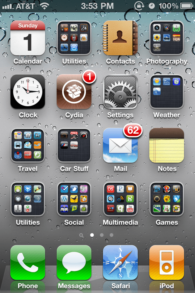 And before you say that’s a lot of apps, I have a jailbreak mod installed that allows more than 12 items to be placed into a folder. It allows you to scroll down to see more apps in the folder. iTunes says I have 119 apps installed. 😕